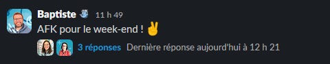 Un truc que je trouve fou et qui mâarrive Ă chaque fois. Quand je mets trop de temps Ă prendre des congĂ©s et que je le fais aprĂšs une pĂ©riode intense de boulot : je tombe malade. JâinterprĂšte ça comme un message de mon corps qui sâĂ©tait mis en mode survie et qui relĂąche la pression.